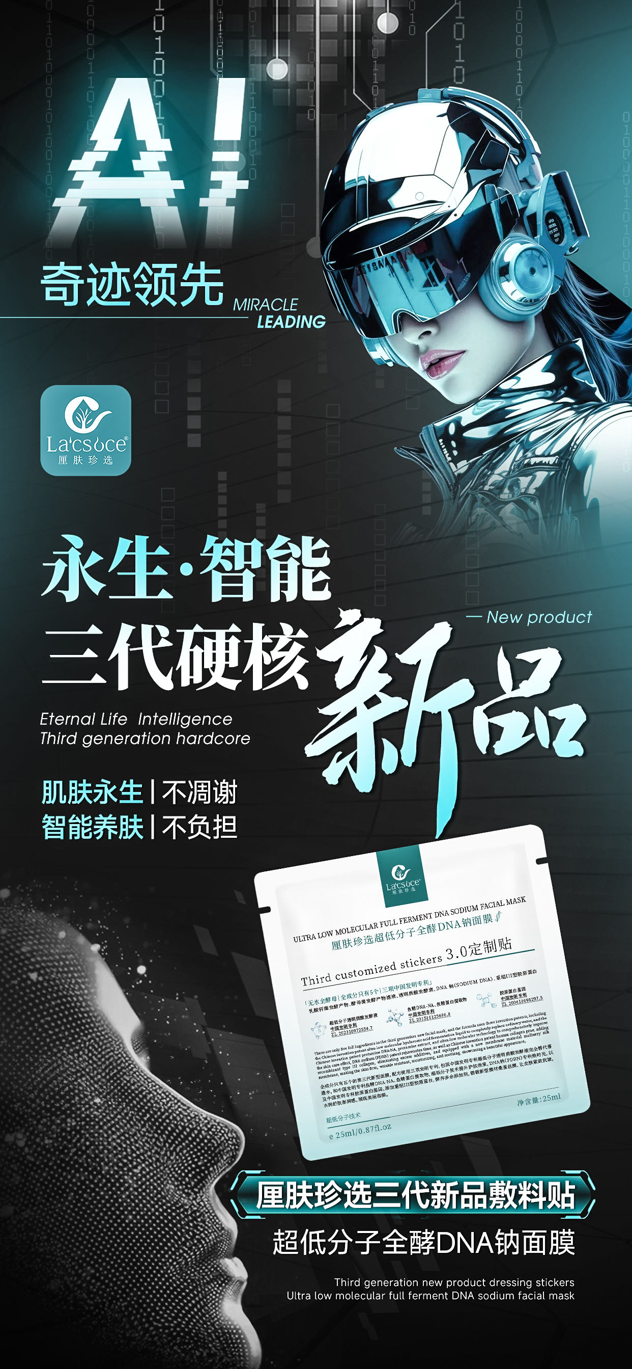 新品采用了史无前例的AI科技理念,并将“永生、智能”作为三代敷料贴的研发理念,这也是厘肤珍选首次推出智能养肤的研发思路,代表“肌肤永生,不凋零;智能养肤,不负担”。