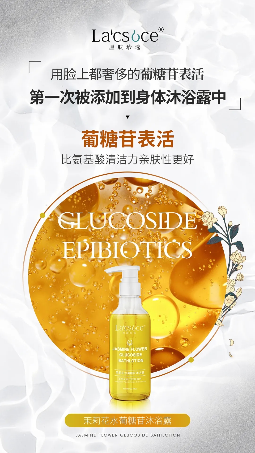 厘肤珍选的工程师们提出了一个大胆的想法,如果在沐浴露中大量加入葡糖苷类表活,是不是就能达到既能清除污垢,又能温和不伤肌肤的神奇功效呢?经过长达一年的配方研究,终于给大家带来了——厘肤珍选茉莉花水葡糖苷沐浴露。