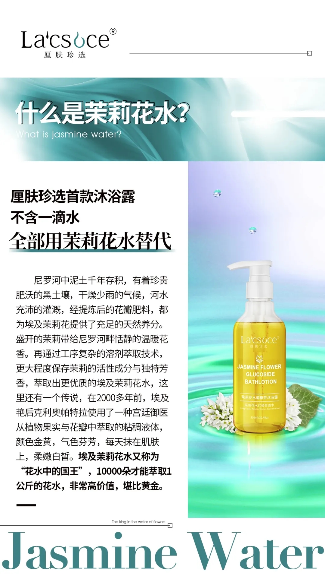 这款沐浴露厘肤珍选的工程师们开创性地做了一次大胆的尝试,直接用茉莉花水,全部代替配方体系中的“普通水”。并且选用的茉莉花水是埃及品种的茉莉,是目前全球范围内萃取品质好的茉莉品品种。